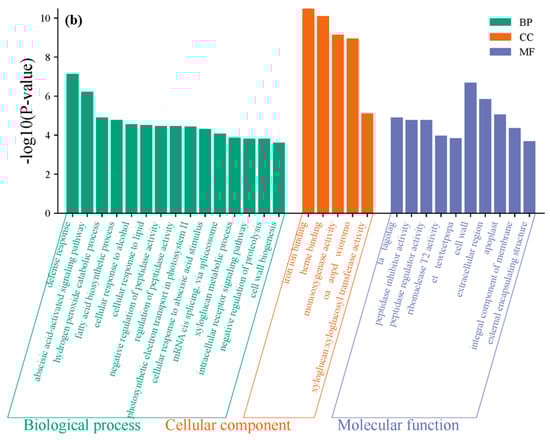 In the GO functional enrichment analysis for PEYP-1-1 vs. PEYP-1-3 (Figure 4b), significant enrichment of GO terms was also observed in “iron ion binding” under the 8 ppm iodide exposure. Iron ions directly impact key indicators such as plant growth, yield, and stress resistance, making them an important trace element for plant health and development. Iodide ions (I−) share similar hydrated ionic radii with iron ions (Fe2+/Fe3+). This structural similarity may lead to I− competing for the metal coordination sites of iron-binding proteins (ferredoxin or peroxidase) [], thereby potentially reducing the enrichment of iron ion binding. However, our experimental results show that the enrichment of iron ion binding remains strong under both 4 ppm and 8 ppm iodine stress. This suggests that iodide ions (I−) might replace sulfur ligands (cysteine residues) in iron–sulfur clusters rather than directly competing with iron [], exposing additional iron ion coordination sites and, consequently, enhancing the enrichment of iron ion binding.