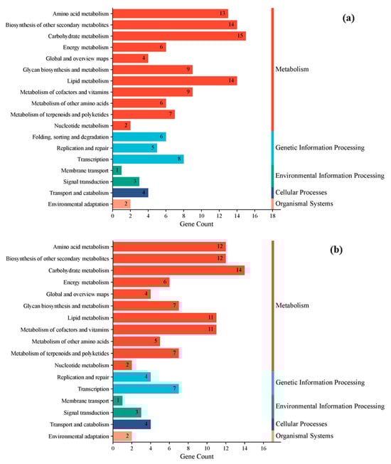 KEGG pathway enrichment classification of genes. Note: (a) PEYP-1-1 vs. PEYP-1-2; (b) PEYP-1-1 vs. PEYP-1-3. The iodine exposure concentrations for the PEYP-1-1, PEYP-1-2 and PEYP-1-3 treatment groups were 2 ppm, 4 ppm, and 8 ppm, respectively.