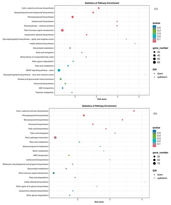This study performed KEGG pathway enrichment analysis on the differentially expressed genes in pepper leaf samples. Based on gene quantity, enrichment factors, and the significance of Q-value corrections, the KEGG pathway enrichment bubble plots (Figure 6) were used for visualization under two different iodine concentrations.