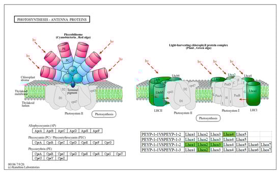 The basic overview of the photosynthesis-antenna protein pathway in PEYP-1-1 vs. PEYP-1-2 and PEYP-1-1 vs. PEYP-1-3. Note: The iodine exposure concentrations for the PEYP-1-1, PEYP-1-2, and PEYP-1-3 treatment groups were 2 ppm, 4 ppm, and 8 ppm, respectively.