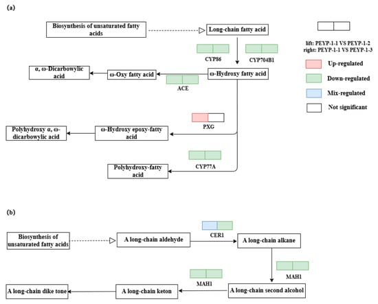 The basic diagram of the biosynthetic pathway of keratin, threonine, and wax. Note: (a) Biosynthetic pathway of keratin and threonine; (b) wax biosynthetic pathway. PEYP-1-1 was the trace iodine control group of leaves, PEYP-1-2 was the moderate iodine exposure group of leaves, and PEYP-1-3 was the excessive iodine exposure group of leaves.