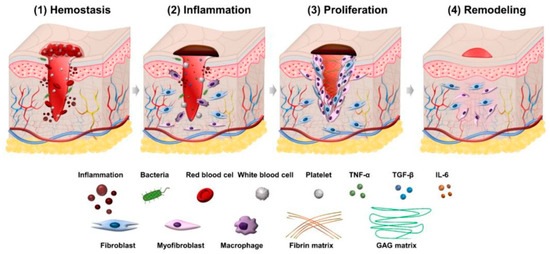 Wound healing involves hemostasis, inflammation, proliferation, and remodeling. Clotting factors restrict blood loss from the wound site and provide a foundation and structural matrix for granulation tissue during hemostasis, which occurs immediately after an injury. This happens shortly after an injury. In acute wounds, phagocytic cells that create reactive oxygen species can prolong the inflammatory phase for seven days. In chronic wounds, this phase may last longer [21,22]. The proliferative phase of wound healing begins when inflammatory cells die. This phase includes blood vessel production, granulation tissue, wound contraction, and epithelialization. The last remodeling phase, which involves scar tissue formation, can take months or years, depending on the wound’s location, severity, and treatment [23,24]. Figure 1 illustrates the phases of wound healing.