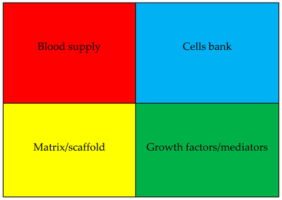 The essential components of wound healing and tissue regeneration include a good blood supply to the healing area, a bank of hard- and soft-tissue-forming cells, a scaffold and matrix that support the healing tissue, and growth and differentiation factors that lead the entire process [29,30]. Figure 2 illustrates these factors.