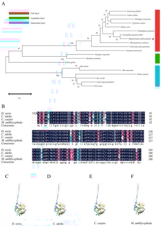 Characterization of vertebrates Gpx4. (A) Phylogenetic tree of vertebrates Gpx4 (the red pentagrams are labeled as the target specie of the study). (B) Multiple sequence alignment of Gpx4 amino acid of four cyprinid fish species. Same sequences are shown in navy blue, with conservative and semi-conservative mutations depicted in pink and blue, respectively. (C–F) Schematic diagram of the tertiary structure of Gpx4 protein of four cyprinid fish species.