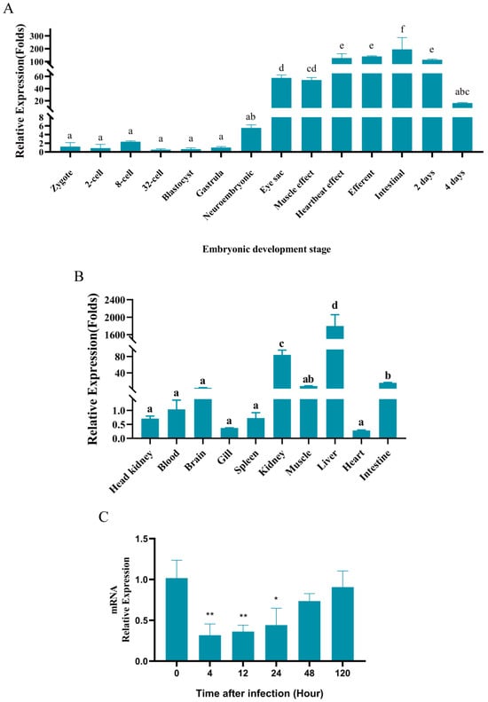 Relative expression of gpx4. (A) Expression of gpx4 at different stages during the embryonic development of M. amblycephala. (B) Expression of gpx4 in healthy M. amblycephala tissues. The letters from a to f indicate that differences in gene expression at various stages of embryonic development and across different tissues are significant (p < 0.05). The same letters signify no significant change. Data are described as mean ± SE (n = 3). (C) Expression of gpx4 in the liver after A. hydrophila infection. Data are described as mean ± SE (n = 3). Statistically significant up-regulation or down-regulation of gene expression is denoted with * (p < 0.05), and ** (p < 0.01).