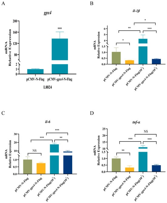 To investigate the regulation of gpx4 on inflammatory factors, we first overexpressed the blunt snout bream gpx4 gene by transfecting pCMV-gpx4-N-Flag plasmid into L8824 cells. The RT-qPCR results show that gpx4 exhibited a significantly elevated expression level, approximately 300-fold, in L8824 cells following pCMV-gpx4-N-Flag transfection, suggesting that this model could be used as a gpx4 overexpression cell model for future experiments (Figure 3A).