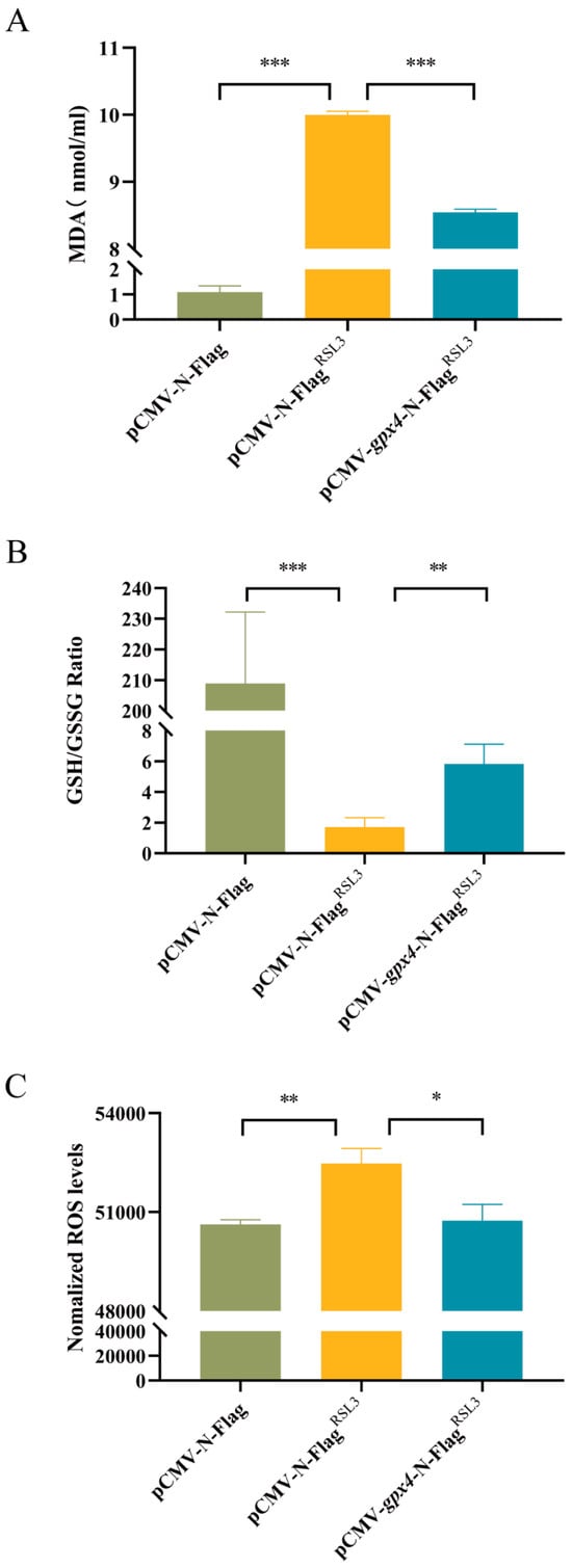 To investigate the impact of gpx4 on the extent of ferroptosis, we conducted a ferroptosis induction experiment using a cell model that overexpressed the gpx4 gene. The experiment was set up with three groups: a control group with no treatment (pCMV-N-Flag), a RSL3 induction group (pCMV-N-FlagRSL3), and a group overexpressing gpx4 and induced with RSL3 (pCMV-gpx4-N-FlagRSL3). Subsequently, the ferroptosis-related parameters in the cells subsequent to the administration of the ferroptosis inducer RSL3 were assessed. The levels of MDA, the end product of lipid hydroperoxides, were significantly elevated after ferroptosis induction in the pCMV-N-FlagRSL3 group. Conversely, MDA levels were markedly decreased in cells with gpx4 overexpression in the pCMV-gpx4-N-FlagRSL3 compared with the pCMV-N-FlagRSL3 group (Figure 4A). Ferroptosis induction significantly decreased the intracellular GSH/GSSG ratio in the pCMV-N-FlagRSL3 group compared with the pCMV-N-Flag group, while gpx4 overexpression increased this ratio (Figure 4B). The results demonstrate a substantial increase in ROS content in the pCMV-N-FlagRSL3 group after ferroptosis induction. However, gpx4 overexpression in the pCMV-gpx4-N-FlagRSL3 group had a notable reduction in ROS levels compared with the pCMV-N-FlagRSL3 group (Figure 4C).