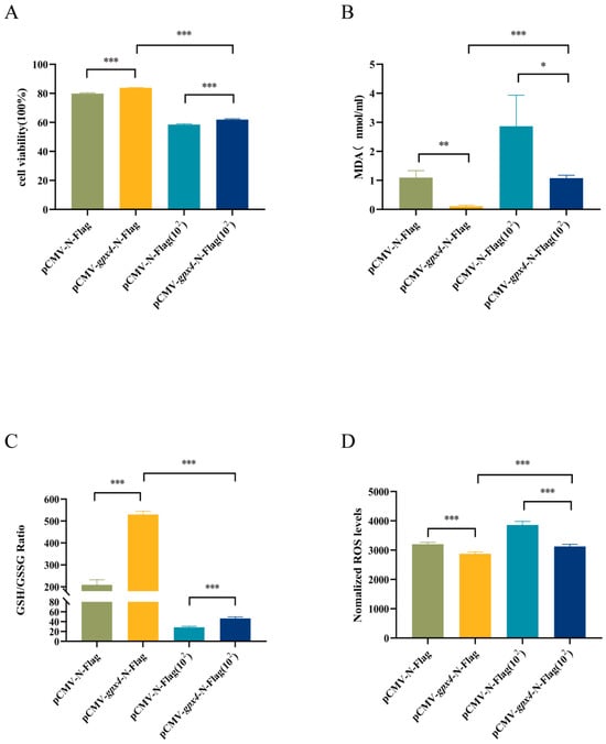 To investigate the potential role of gpx4 in cell viability and ferroptosis induced by A. hydrophila, an experiment was conducted with four groups: a control group with no treatment (pCMV-N-Flag), a group overexpressing gpx4 (pCMV-gpx4-N-Flag), an A. hydrophila infection group (pCMV-N-Flag(102)), and a group overexpressing gpx4 and infected with A. hydrophila (pCMV-gpx4-N-Flag(102)). Ferroptosis-related indicators, including cell viability, MDA, GSH/GSSG ratio, and ROS levels, were then examined. Following A. hydrophila infection, cell viability was markedly reduced. However, cell viability was significantly higher in the groups overexpressing gpx4 (Figure 5A). After A. hydrophila infection, MDA levels were considerably increased, but the MDA content was significantly inhibited by the overexpression of the gpx4 gene (Figure 5B). Additionally, A. hydrophila infection resulted in a marked decrease in the GSH/GSSG ratio. In contrast, overexpression of the gpx4 gene significantly increased the GSH/GSSG ratio (Figure 5C). The results indicate a substantial increase in intracellular ROS content following A. hydrophila infection; however, the overexpression of the gpx4 gene led to a significant reduction in ROS accumulation within the cells (Figure 5D).