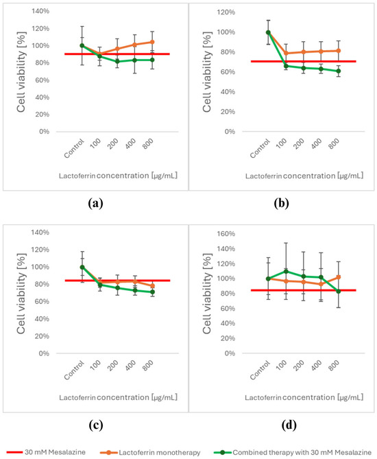 After 24 h of exposure to LACT, a decrease in viability was observed in HT-29 cancer cells only at a concentration of 100 µg/mL (Figure 3a). In the DLD-1 cell line, viability decreased at all tested LACT concentrations, though the effect was less pronounced compared to MES monotherapy (Figure 3b). In HCT-116 cells, the reduction in viability following LACT exposure was comparable to that observed with MES monotherapy (Figure 3c). Normal cells treated with LACT showed no significant changes in cell viability (Figure 3d).