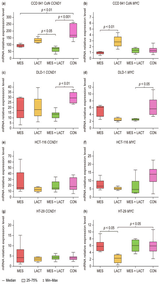 Changes in mRNA levels of (a) CCND1 and (b) MYC in the CCD 841 CoN cell line, (c) CCND1 and (d) MYC in the DLD-1 cell line, (e) CCND1 and (f) MYC in the HCT-116 cell line, and (g) CCND1 and (h) MYC in the HT-29 cell line after 24 h of treatment with 30 mM MES, 400 µg/mL LACT, 30 mM MES + 400 µg/mL LACT, and non-treated control cells (CON). Gene expression levels were normalized to the reference gene TBP and calculated using the 2−ΔΔCT method. Box and whisker plots display the median, lower and upper quartiles, and minimum and maximum values. Abbreviations: MES—mesalazine; LACT—lactoferrin; CON—control (untreated).