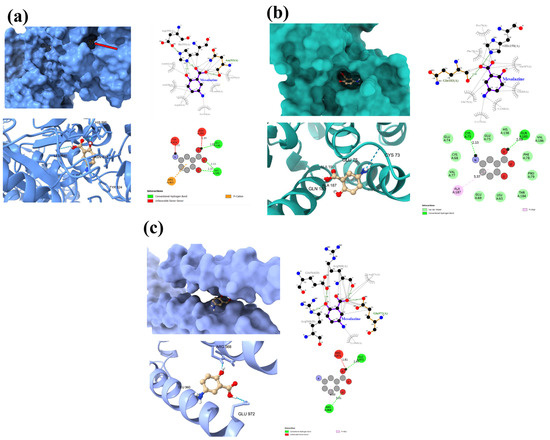 Graphical representation of MES interaction with LACT (a), CCND1 (b), and MYC (c). Red arrow (a) indicates a ligand (MES); green color indicates hydrogen bonds.