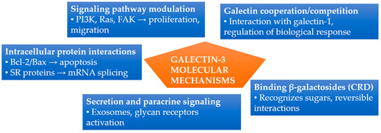 The main molecular mechanisms described above are briefly summarized and illustrated in Figure 1. Galectin-3’s CRD binds β-galactosides reversibly [4]. Intracellularly, gal-3 modulates apoptosis via Bax/Bcl-2 interaction and regulates mRNA splicing through SR proteins [8,28]. It also interacts with PI3K, Ras, and FAK kinases, affecting proliferation and migration. Extracellular secretion occurs via exosomes, mediating paracrine signaling through glycan receptor activation [8]. Additionally, gal-3 cooperates or competes with galectin-1, modulating biological responses [4,55].