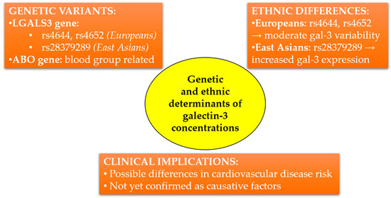 From an epidemiological perspective, higher gal-3 concentrations observed among individuals of Asian descent might partially explain differences in cardiovascular disease incidence across populations. However, further studies incorporating both genetic and environmental contexts are required to precisely elucidate the clinical significance of these observations. The simplified diagram presented in Figure 2 summarizes the current knowledge on genetic variants influencing gal-3 concentrations, highlights ethnic differences, and outlines potential clinical implications.