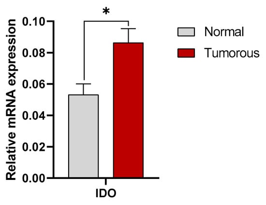 IDO expression at the mRNA level was measured in 20 tumorous and healthy tissue sample pairs. According to the quantitative real-time PCR results, RCC tissue samples showed a significantly higher mRNA expression of IDO compared to the adjacent healthy kidney tissues. The statistical analysis performed with two-way ANOVA with the Sidak multiple comparison test showed significant differences (p = 0.0261) (Figure 1).