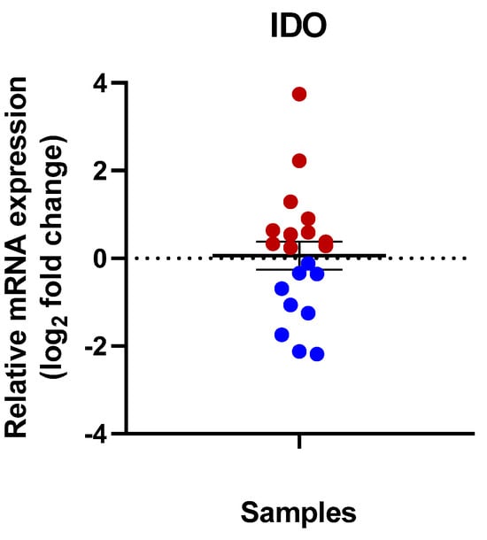 Relative mRNA expression of IDO in human RCC tissue samples. The IDO mRNA level was normalized to the GAPDH housekeeping gene. The mRNA levels of the RCC samples were compared to the adjacent healthy tissue samples; then, the log2 fold change was displayed. A total of 11 samples show upregulation (above the 0 line, red dots) of the IDO in the RCC tissue samples. Blue dots show the group of the downregulated samples for IDO of the studied samples.