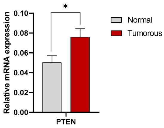 In our study, expression of mRNA for PTEN showed a significantly higher level in tumorous kidney cancer tissues compared to the adjacent healthy tissues. Statistical analyses of two-way ANOVA with Sidak multiple comparison tests show significant differences (p = 0.0271 for PTEN) (Figure 3).