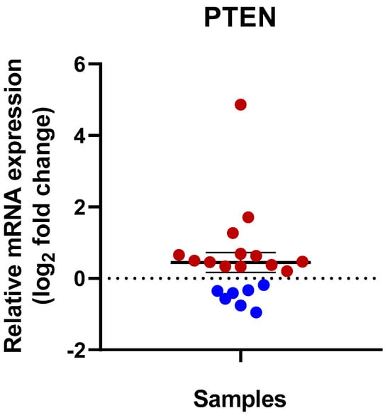 Relative mRNA expression of PTEN in human RCC tissue samples. The IDO mRNA level was normalized to the GAPDH housekeeping gene. The mRNA levels of the RCC sample were compared to the adjacent healthy tissue samples; then, the log2 fold change was displayed. A total of 13 samples show upregulation (above the 0 line, red dots) of PTEN in the RCC tissue samples. Blue dots show the group of the downregulated samples for PTEN of the studied samples.