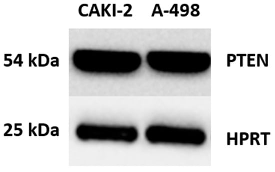 Western blot analysis of the expression of protein for PTEN in CAKI-2 and A-498 cell lines. HPRT was used as a housekeeping protein. A total of 40 µg of proteins were loaded into polyacrylamide gel and separated by electrophoresis (SDS-PAGE); then, protein for PTEN was detected with a specific monoclonal antibody (PTEN (D4.3) XP(R) Rabbit mAB, Cell Signaling Technology, Danvers, MA, USA).