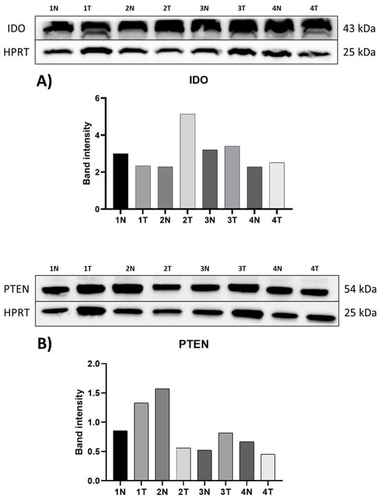 A representative figure of the expression of protein for IDO (A). and PTEN (B) in adjacent healthy (1N; 2N; 3N; 4N) and tumorous (1T; 2T; 3T; 4T) ccRCC tissue samples. The bands 1, 2, 3, and 4 representing the protein expression of IDO and PTEN are identical to patient numbers 10, 11, 5, and 3, respectively. A total of 40 µg of each protein sample isolated from tissue samples were loaded onto polyacrylamide gel and separated by electrophoresis (SDS-PAGE). A specific monoclonal antibody was used for PTEN (PTEN (D4.3) and IDO (IDO, D5J4E). The intensity of the protein bands was quantified using the Image Lab software (version 5.2.1, Bio-Rad Laboratories Inc., Hercules, CA, USA). (A): According to the band intensities, the first sample pair shows downregulated IDO expression, while in the other samples IDO was upregulated in the tumorous tissue sample compared to the healthy ones. (B): PTEN was upregulated in the tumorous samples compared to the healthy ones in the first and third samples, while in sample two and four PTEN expression was downregulated.