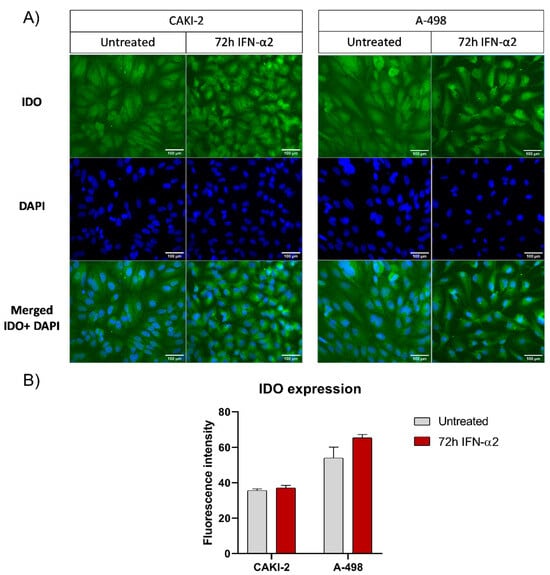 Treatment with IFN-α2 for 24–72 h induced IDO expression in both CAKI-2 and A-498 human kidney cancer cell lines. IDO expression significantly increased after 24 h of treatment in both cell lines, showing a higher level of induction in A-498 cells compared to CAKI-2 cells. According to the real-time qPCR analysis (Supplementary File for Figure S1), IDO levels gradually decreased by 72 h, approaching those of the untreated control cells, although levels remained slightly elevated even at this later time point. The fluorescent microscopic observation of the interferon-alpha-2-treated CAKI-2 and A-498 cells showed a slightly positive IDO staining. Moreover, both kidney cancer cell lines treated with IFN-α2 exhibited higher expression of IDO compared to the untreated cells. IDO expression after the 72 h treatment with IFN-α2 was elevated in both of the investigated cell lines. These results confirm that the microenvironment of the kidney cancer cells might significantly affect the expression of IDO (Figure 7B).