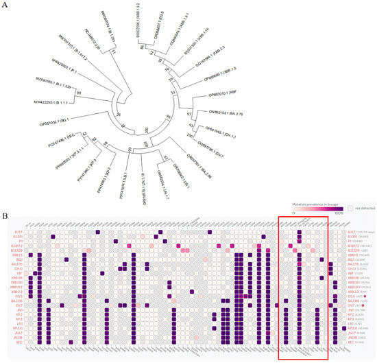 (A) Phylogenetic tree of the 25 dominant variants. (B) Mutation frequency of sites in the ORF1a region in the 25 variants, with the NSP6 mutation regions highlighted in red boxes. The intensity of purple indicates the mutation frequency for each variant.