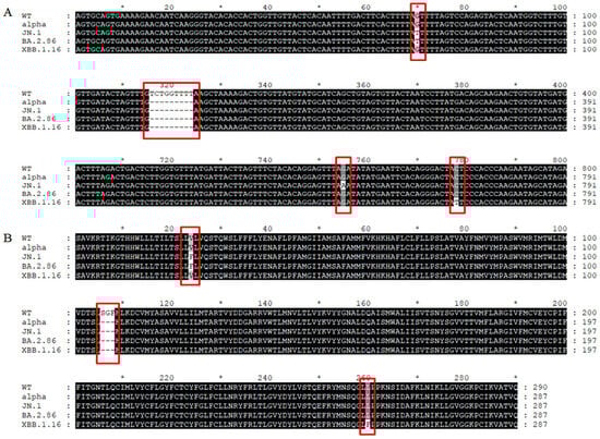 (A) Comparative analysis of nucleotide sequences of NSP6 in the studied variants, using the WT-NSP6 sequence as the reference, with mutant sites highlighted in red boxes. (B) Comparative analysis of amino acid sequences of NSP6 in the studied variants, using the WT-NSP6 sequence as the reference, with mutant sites highlighted in red boxes. “*” was used to mark the position of every tenth site in the sequence.