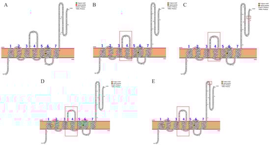 TMHMM2.0 was employed to determine the transmembrane regions of NSP6 mutant proteins, and the protein topology was predicted using the Protter server (https://wlab.ethz.ch/protter/#, accessed on 22 August 2024). The results showed that NSP6 proteins of different variants contained transmembrane regions with seven transmembrane helices, and belonged to transmembrane proteins (Figure 3).