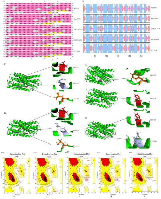 Tertiary structure models of NSP6 were forecasted using the I-TASSER server and validated using SAVES (Figure 4H–L). The Ramachandran plot showed that over 90% of the amino acid residues fell within the most favored and allowed regions, with less than 5% in disallowed regions, confirming high model accuracy.
