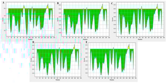 Predicted B-cell epitopes of NSP6 proteins of five SARS-CoV-2 variants. (A–E) correspond to WT, Alpha, XBB.1.16, BA.2.86, and JN.1 strains, respectively. On the graphs, the Y-axes depicts for each residue the correspondent score, while the X-axes depicts the residue positions in the sequence. The larger score for the residues might be interpreted as that the residue might have a higher probability to be part of epitope (those residues are colored in yellow on the graphs).