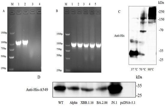 Identification and protein expression of A549 cells transfected with NSP6 plasmid. (A) Gel electrophoresis of NSP6 plasmid PCR products. M: marker; lanes 1, 2: WT-NSP6; lane 3: pcDNA3.1; lane 4: negative control. (B) Gel electrophoresis of PCR products from NSP6 plasmids of different variants. M: marker; lanes 1–5: WT–NSP6, Alpha–NSP6, XBB.1.16–NSP6, BA.2.86–NSP6, JN.1–NSP6. (C) NSP6 protein expression under different temperature conditions. (D) Protein expression of different variants of NSP6-transfected A549 cells.