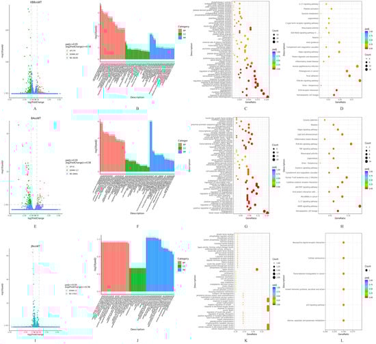 Transcriptomic analysis of NSP6 variants. (A,E,I) Volcano plots comparing XBB.1.16–NSP6, BA.2.86–NSP6, and JN.1–NSP6 to WT–NSP6, respectively. The dashed lines indicate the threshold of |log2(fold change)| > 0.58. (B,F,J) GO enrichment bar charts. (C,G,K) GO enrichment scatter plots. (D,H,L) KEGG enrichment scatter plots.