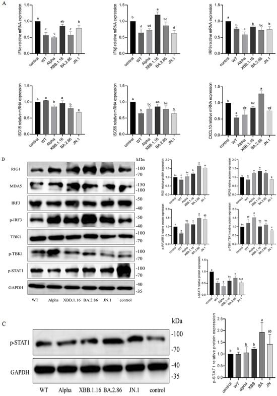 Effect of different variants of NSP6 on type I interferon signaling pathway in A549 cells. (A) Effects of NSP6 variants on mRNA expression of antiviral factors. (B) Impact of NSP6 variants on type I interferon signaling proteins. (C) p-STAT1 expression after RO8191 treatment. Groups sharing a common letter show no significant variation (p > 0.05); distinct letters denote significant differences (p < 0.05).