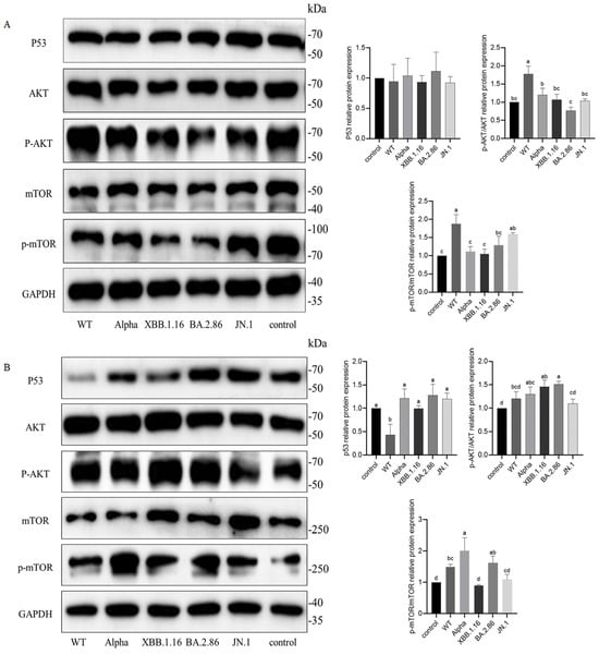 Effect of different variants of NSP6 on p53-AKT-mTOR pathway protein expression in A549 cells. (A) Protein expression in untreated A549 cells. (B) Protein expression in Pifithrin-α-treated A549 cells. Groups sharing a common letter show no significant variation (p > 0.05); distinct letters denote significant differences (p < 0.05).