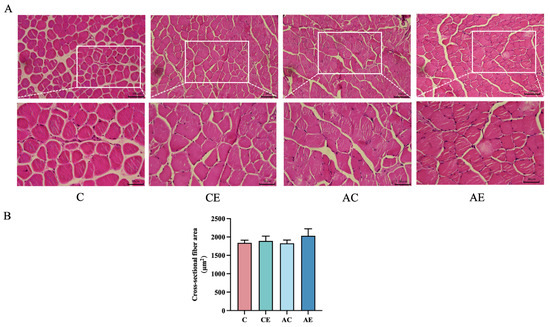 Quadriceps femoris muscle samples were rinsed in pre-cooled PBS, fixed in paraffin, and sectioned using a microtome. Tissue sections were deparaffinized with two changes of xylene (5 min each) and rehydrated through a graded ethanol series (100%, 95%, 90%, and 75%). Sections were stained with hematoxylin for 15 min, rinsed in running tap water until blue, and counterstained with eosin for 30 s. Dehydration and clarification were performed using sequential immersion in 95% ethanol (twice, 1 min each), anhydrous ethanol (twice, 10 s each), and xylene (twice, 1 min each). Coverslips were mounted with glycerol gelatine for microscopic examination. Cross-sectional areas were analyzed using ImageJ software (Ver 1.51-java 8).