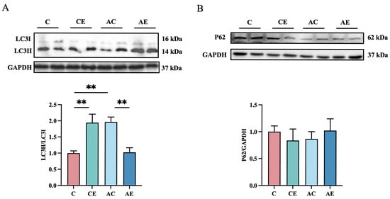 To assess the impact of exercise on autophagy, the expression of p62 and LC3 I/II proteins was examined (Figure 5). No significant differences in p62 expression were observed among the groups. Compared to the C group, the LC3 II/LC3 I ratio was significantly increased in the AC group (p < 0.01). Aerobic exercise further enhanced the LC3 II/LC3 I ratio in the CE group (p < 0.01), whereas a significant reduction (p < 0.01) in this ratio was observed in the AE group following exercise.