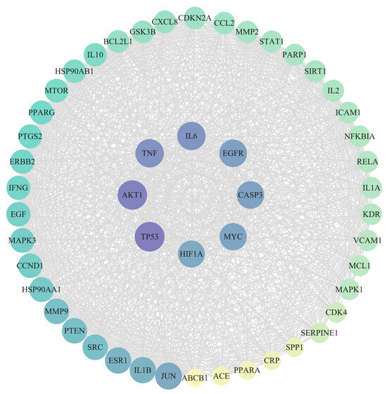 The protein–protein interaction (PPI) network was constructed using the therapeutic targets identified in the previous step, based on data from the STRING database (https://cn.string-db.org, accessed on 12 May 2025). Core targets were subsequently identified by assessing their degree, betweenness, and closeness values using the CentiScape 2.2 tool within Cytoscape 3.10.3. The core targets were selected based on their median values across the three parameters, with the screening results ranked according to their degree values.