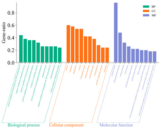 The GO enrichment analysis results were filtered using a p-value threshold of <0.01 and sorted by gene generation. The top ten biological processes (BPs), cellular components (CCs), and molecular functions (MFs) were compiled into a combined histogram (Figure 4). The analysis revealed that in terms of BPs, the key functions included the positive regulation of transcription by RNA polymerase II, negative regulation of apoptotic processes, and positive regulation of gene expression. The CCs are predominantly located in the cytoplasm, nucleoplasm, and cytosol, while the MFs are chiefly associated with protein binding, identical protein binding, and enzyme binding during astragalus treatment of AP.