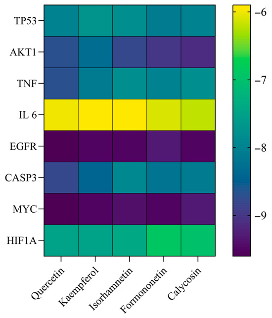 Using AutoDock Vina 1.1.2, quercetin, kaempferol, isorhamnetin, formononetin, and calycosin were docked with receptor proteins based on 3D structures of core targets. The binding energies and modes for each complex were calculated. The results indicate that the binding energies for these active components with the core target proteins were below zero, suggesting potential interactions (Figure 7).