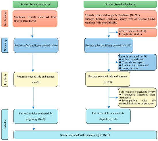 A total of 211 studies were retrieved from databases, with no additional studies found from other sources. Following the removal of 118 duplicate studies, 25 articles were screened based on their titles and abstracts to exclude animal experiments, clinical case reports, reviews, comments, and survey reports. Ultimately, 6 studies met the eligibility criteria for inclusion in the meta-analysis after excluding those involving non-astragalus therapeutic measures and those incompatible with the research indicators and objectives upon full-text evaluation [9,10,11,12,13,14] (Figure 9).