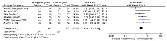 A total of 619 patients were included across six studies, with 312 in the astragalus group and 309 in the control group. A fixed-effects model was employed due to the absence of significant heterogeneity (I2 = 7%, p = 0.37). The meta-analysis indicates that astragalus is effective in treating AP [OR = 3.13, 95%CI (1.93–5.08)] (Figure 11).