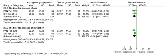 Two studies, involving a total of 256 participants (129 in the astragalus group and 127 in the control group), were analyzed using a fixed-effects model due to the lack of significant heterogeneity in gas passage (I2 = 0%, p = 0.79) and defecation passage (I2 = 0%, p = 0.79). The meta-analysis results indicate that astragalus can reduce the recovery time for gas passage [MD = −3.53, 95%CI (−6.17~−0.88)] and defecation [MD = −3.56, 95%CI (−6.27~−0.85)] (Figure 12).