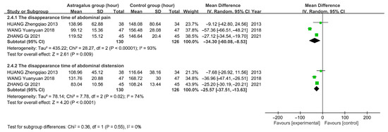 For the disappearance time of abdominal pain and distension, three studies with 256 patients were assessed using a random-effects model due to high heterogeneity. The analysis exhibits that astragalus decreases the disappearance time of abdominal pain [MD = −34.30, 95%CI (−60.08, −8.53)] and distension [MD = −25.57, 95%CI (−37.51, −13.63)] (Figure 13).