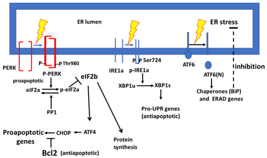 The response of ER stress of three ER membrane resident stress sensors and downstream responses. The designation of p-PERK, p-eIF2a, and CHOP as proapoptotic relates to prolonged ER stress.