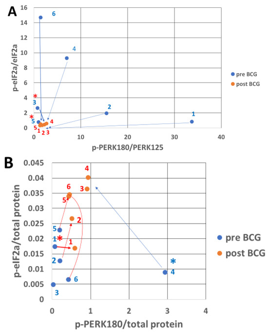 Inactivated eIF2a protein (p-eIF2a) abundance versus its activated kinase p-PERK abundance. Pre-BCG p-PERK (x-axis) is plotted against its responsive substrate pre-BCG p-eIF2a (y-axis, blue dots), each relative to its total pre-BCG abundance (A). The same relation is depicted for each patient post-BCG treatment in red. (A) Note the drastic reduction in the post-BCG ratios and the restriction to the lower left corner. For patients 3 and 5, the red asterisk denotes a slight increase in p-PERK expression; the mean p-PERK activity pre-BCG is 9.9139 and post-BCG is 0.218 (p = 0.094, n = 6) according to the T-test. The parallel pre-BCG expression of the inactive p-eIF2a form is 5.042 and becomes 0.4437 post-BCG (p = 0.038, n = 6) by T-test. (B) p-PERK and p-eIF2a are related to the total cell protein for each patient pre- versus post-BCG treatment. The mean p-PERK/total protein ratio is 0.4107 pre and 0.6383 post-BCG (p = 0.459, n = 6) by T-test. In parallel, the pre-BCG mean p-eIF2a/total protein level is 0.0075 (high activity) versus 0.0213 post-BCG, demonstrating lower activity relative to the reduced protein translation (p = 0.019, n = 6) according to the T-test. Exceptional results shown by the blue and red asterisks indicate heterogeneity in patient response. See Table S1 for data.