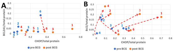The impact of BCG on Bcl2A1 and Bcl2 cell survival proteins in parallel to the proapoptotic transcription factor CHOP. In all the patients, the CHOP/total protein abundance ratio increased by treatment with BCG (y-axis red versus blue dots (and red dashed arrows) panels A and B). The range of Bcl2A1 changes (x-axis, A) is small, except for patient 6. The range of Bcl2 changes is much more pronounced (B) than seen for Bcl2A1 (A). The mean activity of CHOP relative to total protein is 0.14796 pre- and 0.33726 post-BCG, which is significant (p = 0.0022, n = 6) according to a paired T-test. The mean Bcl2 activity is 0.08712 pre- and 0.15426 post-BCG, insignificant according to a T-test (p = 0.315, n = 6) as patients 5 and 6 have lost activity. By T-test, Bcl2A1 showed insignificant mean activity after BCG therapy (p = 0.342, n = 6).