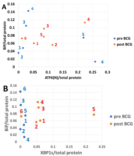 Figure 5 shows the pre- versus post-BCG levels of ATF6(N), XBP1s, and OASIS matched with levels of the BiP protein expression in response to these transcription factors. The pre-BCG abundance of ATF6(N) is substantially higher than that of XBP1s in patients 2, 3, 4, 5, and 6 by >10, >26, >21, >14, >2000 fold, respectively, and in patient 1, it is only >1.3 fold higher than the XBP1s. The pre-BCG abundance of OASIS was higher than that of XBP1s in patients 1, 2, 3, 5, and 6 by >6, >4800, >19, >5, and >2300 fold, respectively. Patient 4 was an exception in which OASIS abundance was 0.1 of that of XBP1s. These results are consistent with the delayed XBP1 protein expression compared with the faster expression of ATF6(N) [30], which is synergistic with OASIS. In all patients post-BCG treatment, XBP1 abundance was higher than that of the pre-BCG samples. The ATF6(N) abundance was reduced in patients 4, 5, and 6 and increased in 1, 2, and 3 after BCG treatment, indicating a BCG mitigating effect on ATF6(N). The abundance of OASIS increased after BCG treatment in all patients.