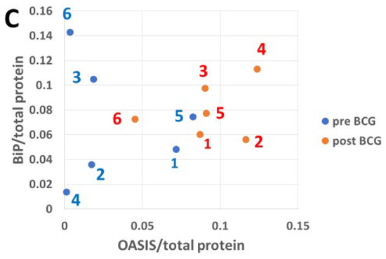 The effect of BCG on UPR transcription factor activation responding to ER stress sensors. BiP (y-axis) transcription target abundance plotted in comparison to that of ATF6(N) (A), XBP1s (B), and OASIS (C) (x-axis). Note the very low levels of pre-BCG XBP1s compared to ATF6(N). The mean ATF6(N)/total protein levels pre-BCG grew only slightly and insignificantly from 0.0917 to 0.0953 post-BCG (p = 0.46, n = 6, panel A) according to the T-test; only patients 1, 2, and 3 contributed to its growth. The mean BiP/total protein abundance ratio grew minimally from 0.0699 pre-BCG to 0.0794 post-BCG (by T-test, p = 0.343, n = 6, y-axis in panels A–C); only patients 1, 2, and 5 contributed to its growth. The mean OASIS/total protein grew significantly from 0.0353 pre-BCG to 0.0923 post-BCG (by T-test, p = 0.012, n = 6, x-axis panel C).