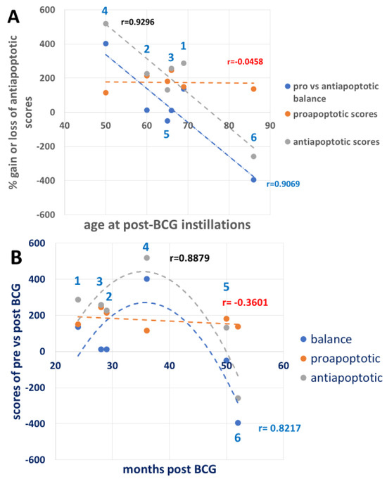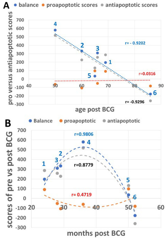 UPR signaling scores of BCG-induced percent changes versus patient age and months post-BCG treatment (Table 1). (A) The effect of age on the scores post-BCG treatment (from Table 2) resulting from the sum of percent changes of pro- versus antiapoptotic UPR signals and the balance between them (antiapoptotic r = −0.9296, proapoptotic r = 0.03162, for the balance between them r = −0.9202). The proapoptotic scores result from p-PERK and p-eIF2a related to total PERK and eIF2a, respectively. The difference between pro- and antiapoptotic correlations and between the balance and the proapoptotic correlation, according to Fisher’s r-to-z transformation test, is significant (p = 0.0388 and p = 0.0400, respectively). (B) The effect of time elapsed from BCG treatment (Table 1) to signaling score differences in PBMCs (Table 2) shows differences between the proapoptotic versus antiapoptotic values, with the best fit being a binomial correlation (proapoptotic r = −0.4719 versus antiapoptotic r = 0.8779, correlation difference p = 0.0213). The difference in apoptotic regression (r = −0.4719) from the regression of balance (r = 0.9806) is significant (p = 0.0005) in Fisher’s transformation. Dashed red, gray, and blue lines denote proapoptotic, antiapoptotic, and the balance between them, respectively.