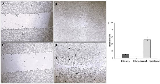 Light microscopy images of C6 cells (10×). (A) Control cells at 0 h; (B) control cells at 24 h; (C) C6 cells exposed to bevacizumab plus fingolimod at 0 h; (D) C6 cells exposed to bevacizumab/fingolimod at 24 h; (E) comparison of statistical significance of inhibition rate between the groups. * (p < 0.05 compared to control cells).