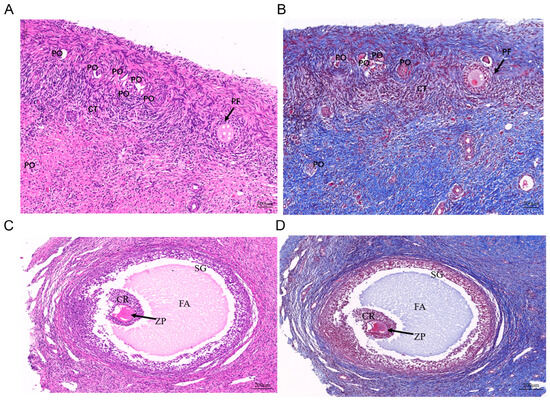 Histological characteristics of Meigu goat ovary. (A,B) Histological characteristics of the ovary of Meigu goat before sexual maturity (A represents HE staining, B represents Masson staining). Scale bar = 500 µm. (C,D) Histological characteristics of mature follicles of Meigu goat (C represents HE staining, D represents Masson staining). Scale bar = 200 µm. PO: Primary oocyte; PF: Primary follicle; CT: Connective tissue; SG: Stratum granulosum; FA: Follicular antrum; CR: Corona radiata; ZP: Zona pellucida.